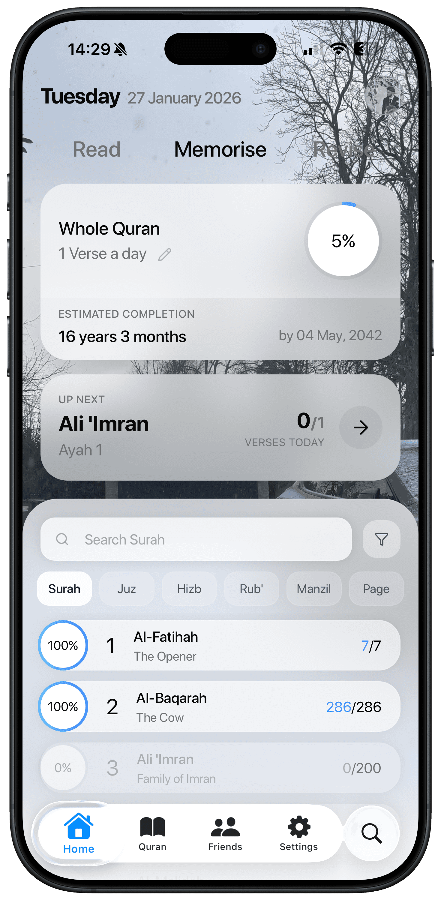 HifdhQ is a structured way to memorise the Qur’an that focuses on steady review and long-term retention. It helps you learn at a calm, realistic pace, revisit what you’ve memorised so it stays strong, and understand the meaning simply as you go.