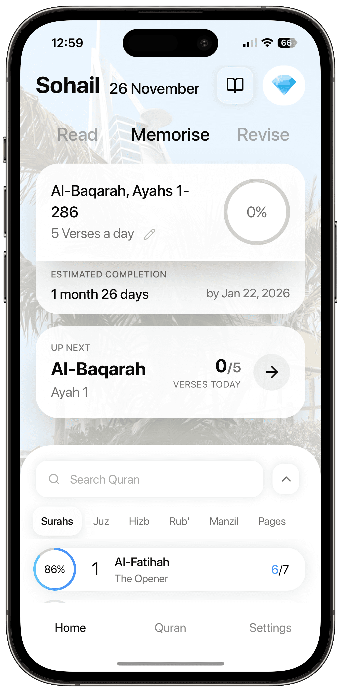 HifdhQ is a structured way to memorise the Qur’an that focuses on steady review and long-term retention. It helps you learn at a calm, realistic pace, revisit what you’ve memorised so it stays strong, and understand the meaning simply as you go.